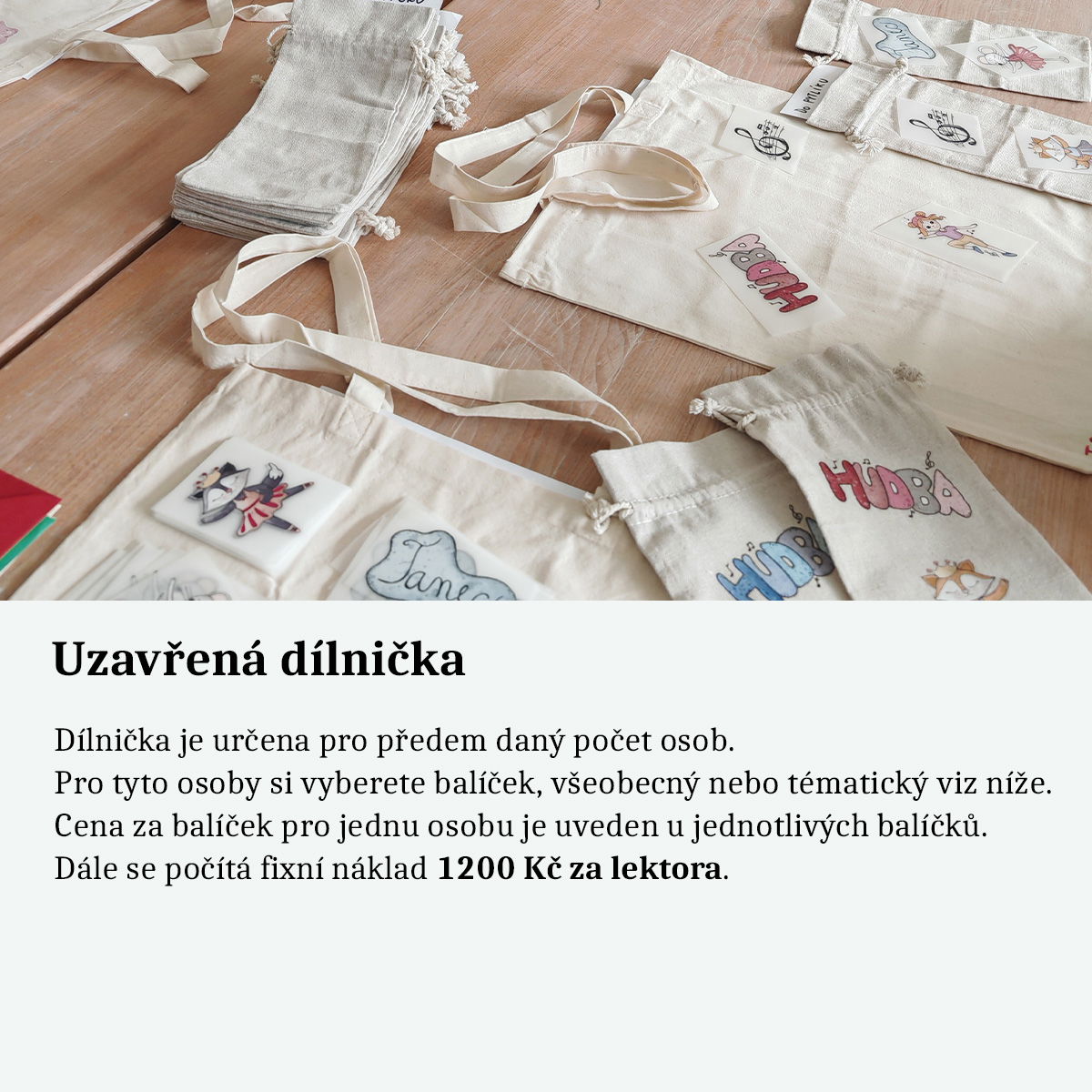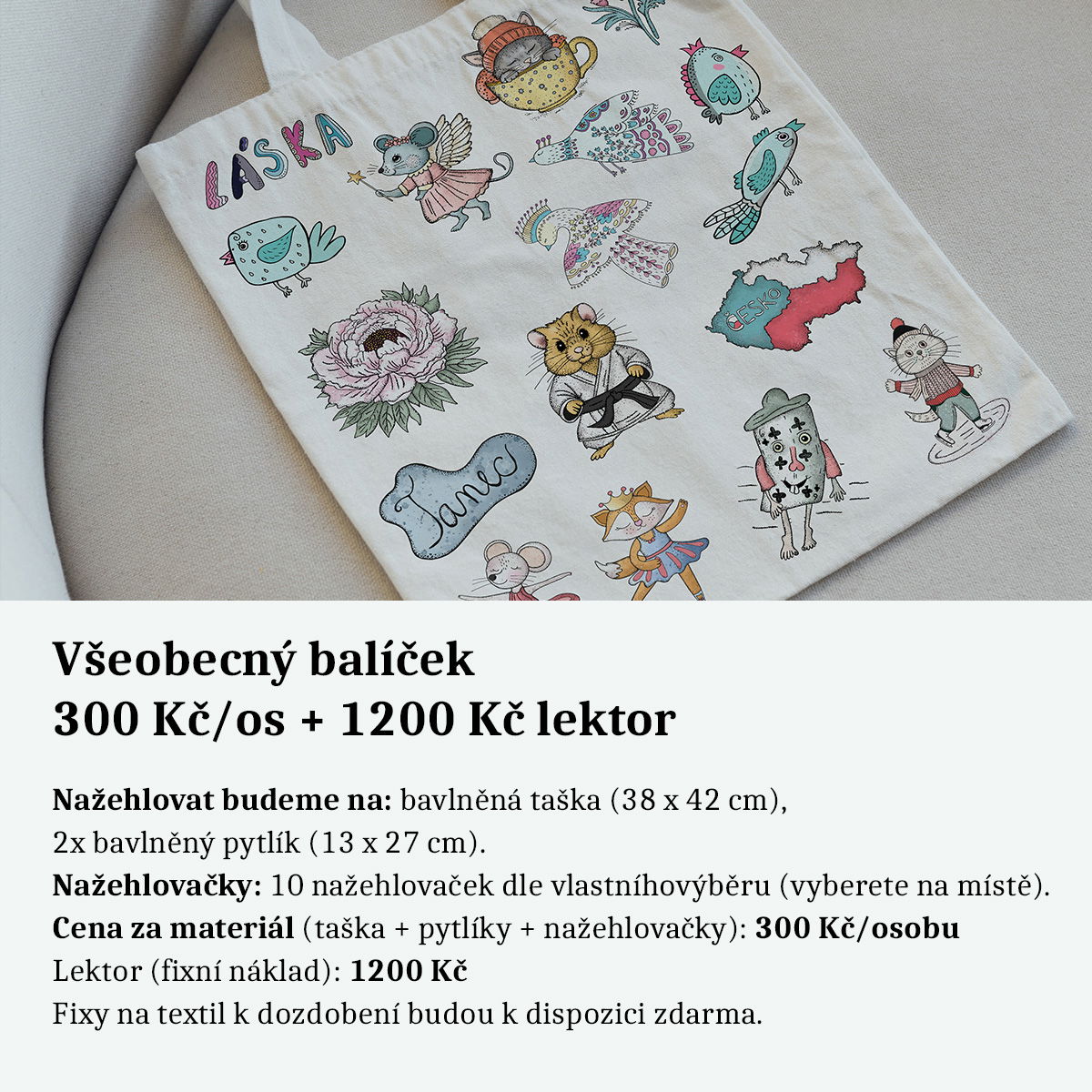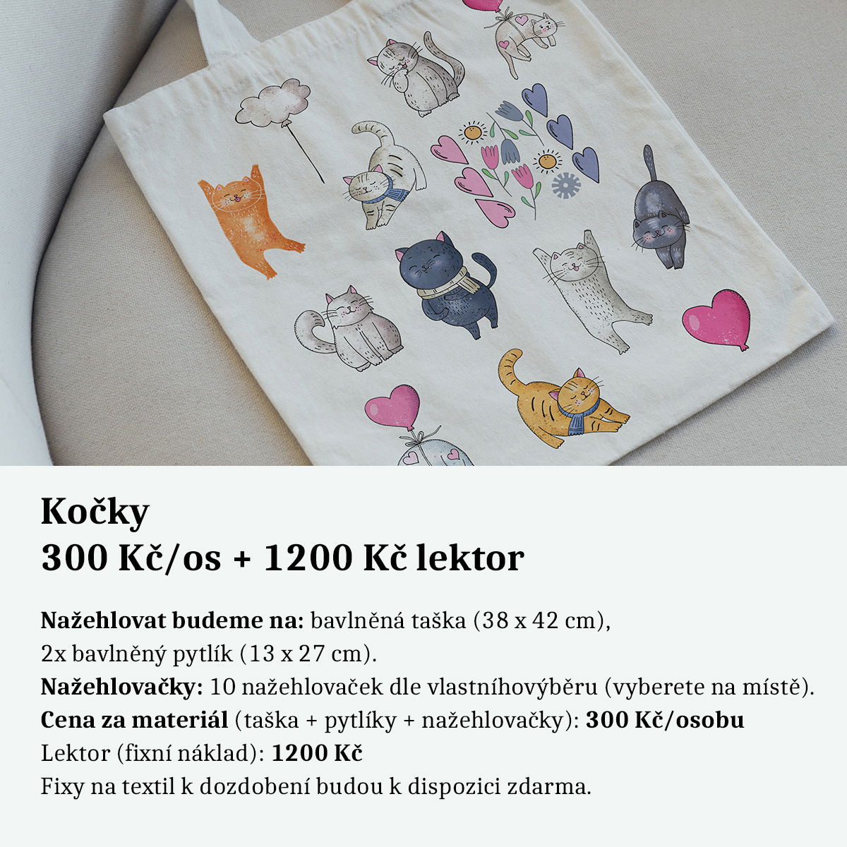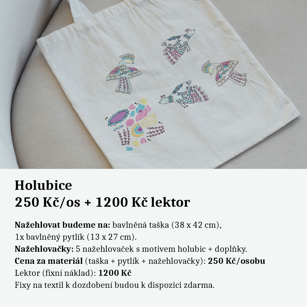 Nažehlovací dílnička je skvělou příležitostí, jak si vyzkoušet jednoduchou, ale velmi efektní techniku tvorby s využitím autorských ilustrací.Každý účastník si může vytvořit vlastní bavlněnou tašku nebo pytlík s obrázkem podle svého výběru. Nažehlování probíhá pomocí malých žehliček, které jsou bezpečné i pro menší děti. Po nažehlení si mohou účastníci své výrobky dozdobit textilními fixy a dodat jim tak osobitý styl.